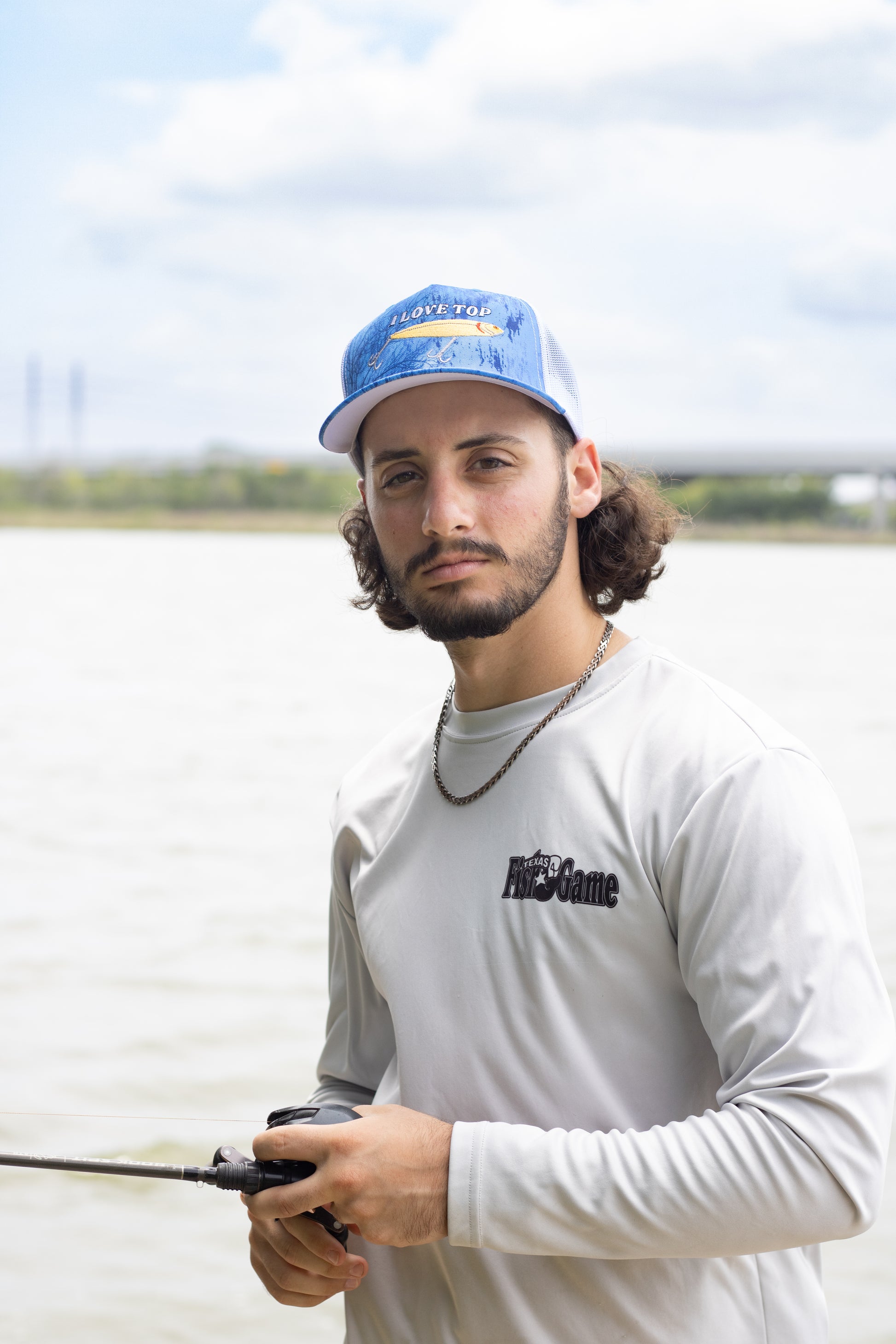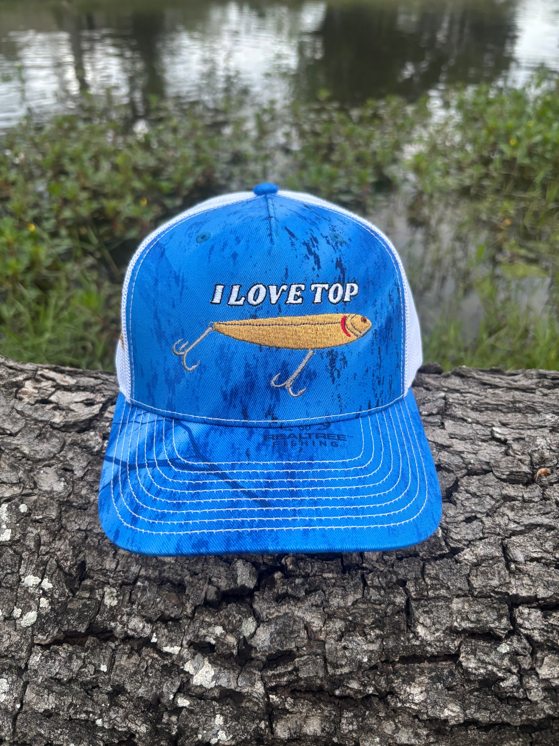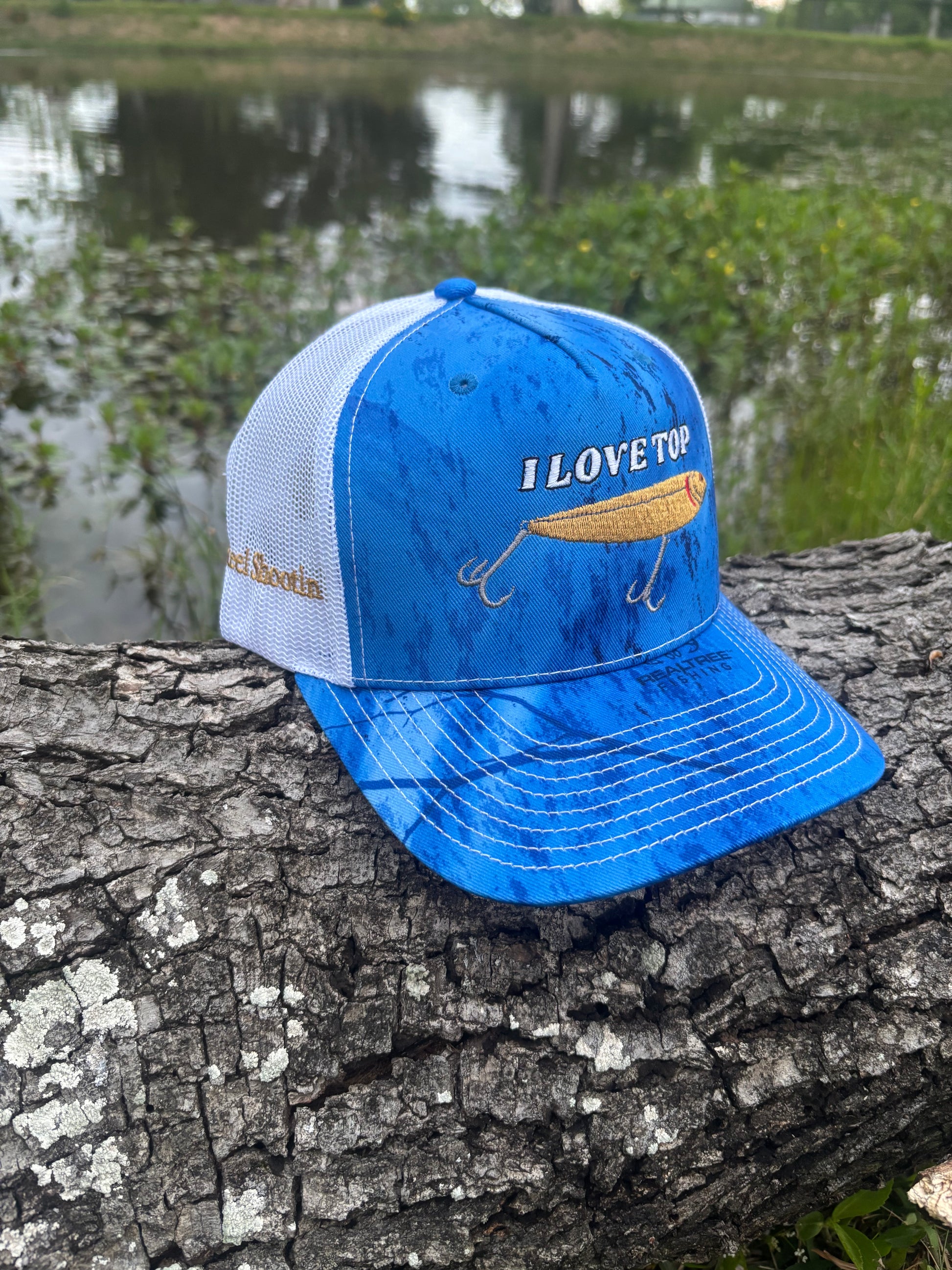 Richardson 5 panel snapback featuring our "I Love Top" design; this design was made for the fishermen who just can't get enough of that top water action. And it's funny.