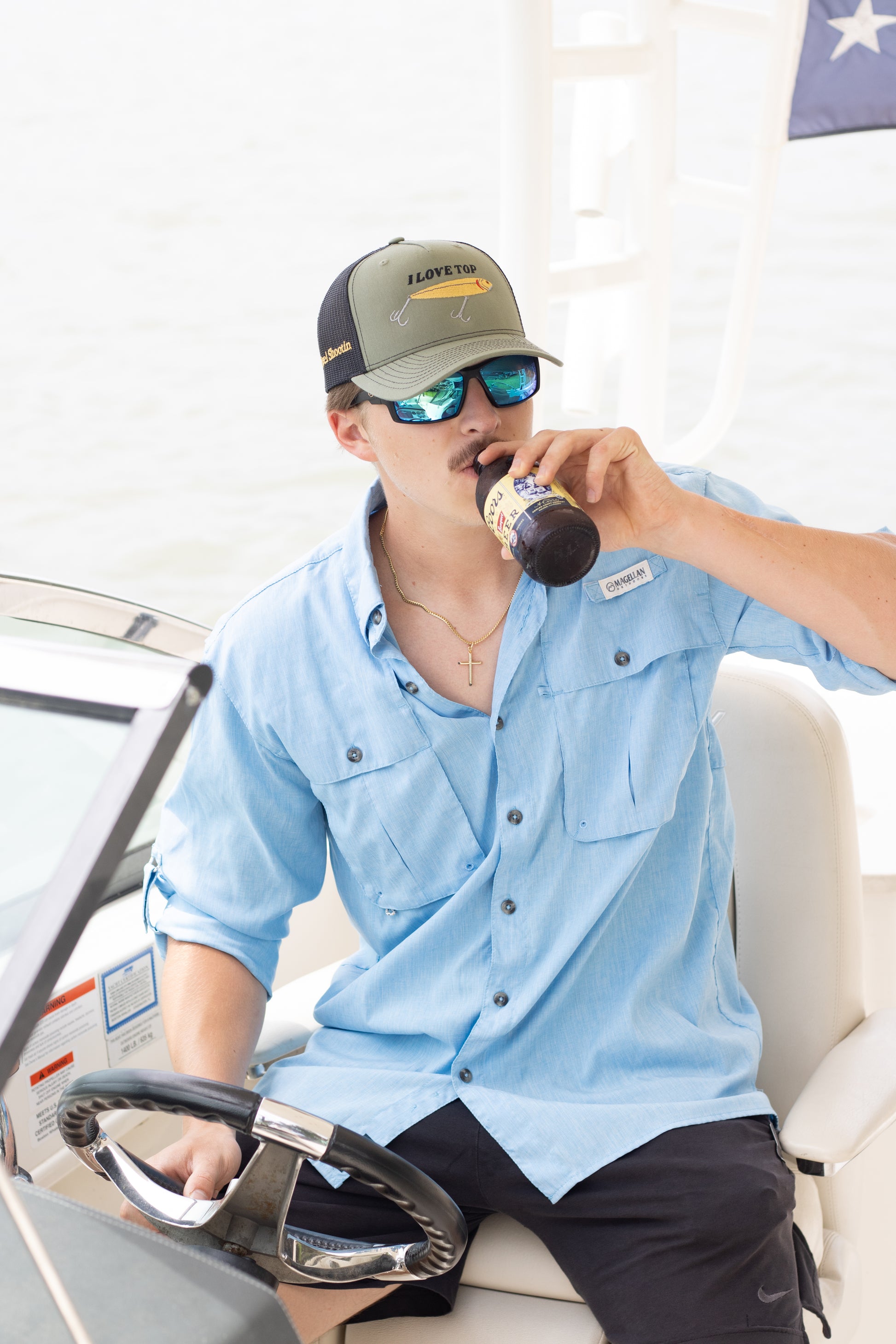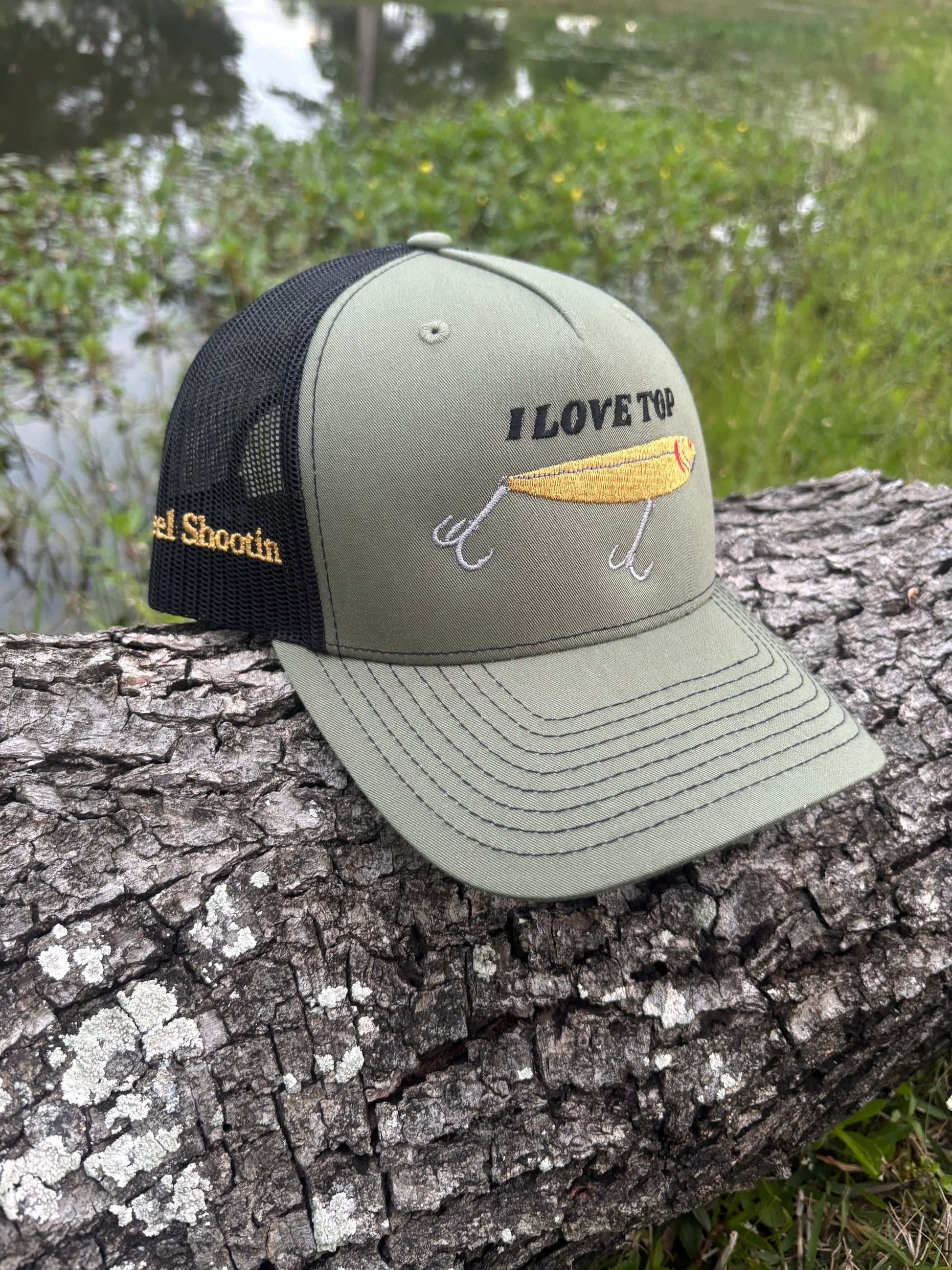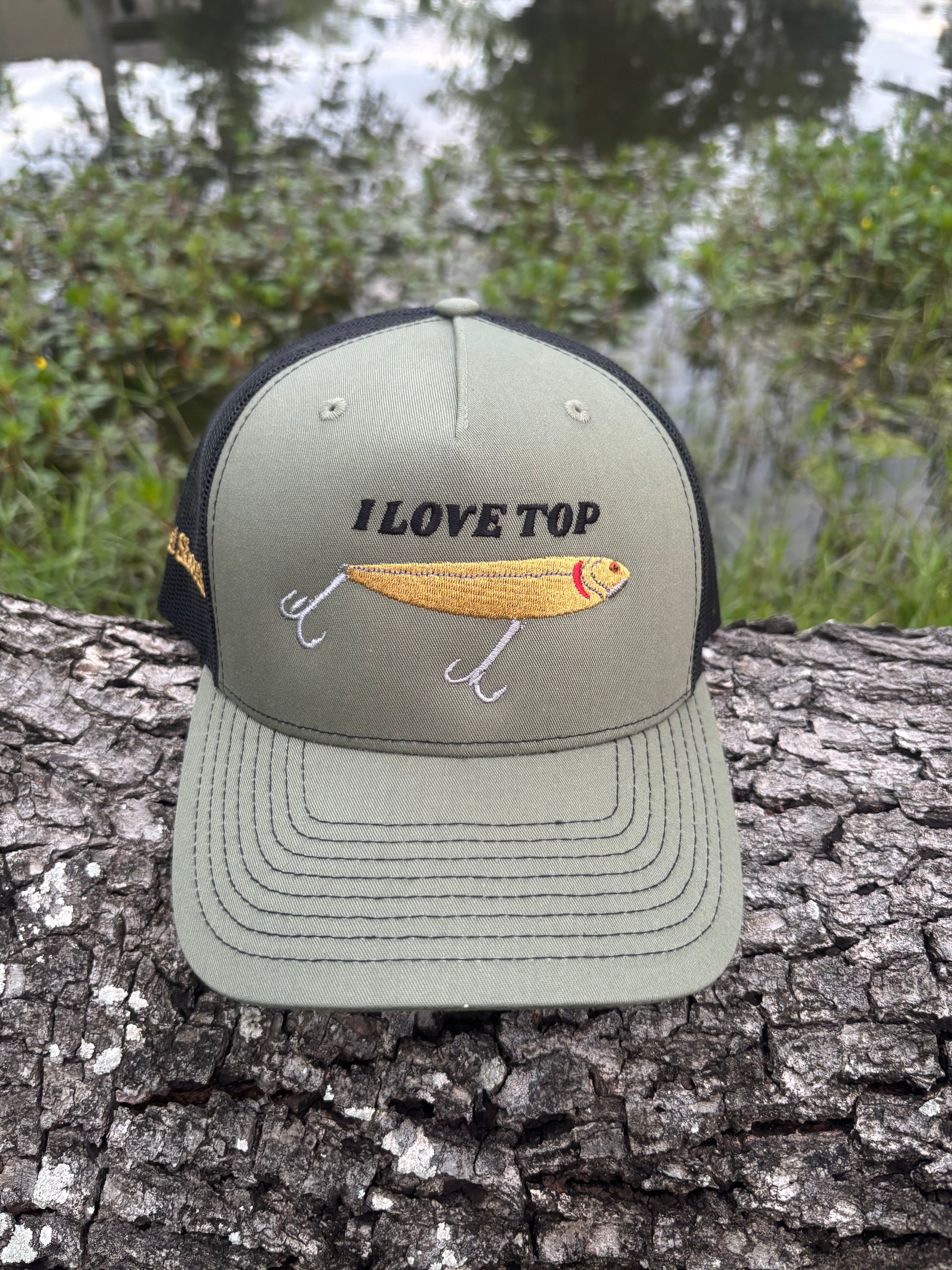 Richardson 5 panel snapback featuring our "I Love Top" design; this design was made for the fishermen who just can't get enough of that top water action. And it's funny.